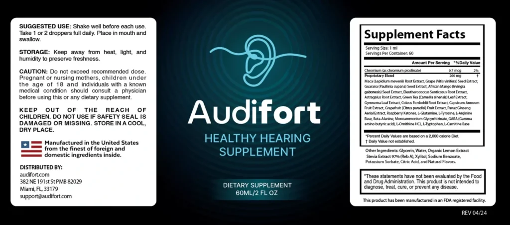 Guaranteed quality: The real Audifort® is formulated with rare, clinically-tested ingredients like Japanese Alpine Ginkgo Biloba, HydroPure NAC, and Lion’s Mane – manufactured in FDA-registered, GMP-certified facilities with rigorous third-party testing.